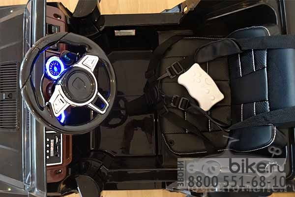 Детский электромобиль Jeep «Гелендваген» может похвастать роскошным салоном. В машине установлено комфортабельное «кожаное» сиденье с ремнями безопасности, приборная панель оснащена подсветкой. Аудиосистема Гелендвагена позволяет проигрывать музыку с SD-карты, флешки или MP3-плеера. Машина оборудована пультом родительского контроля, работающим на расстоянии до 10 метров.